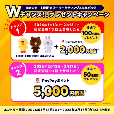 平素より、認定資格「LINEヤフーマーケティングスキルバッジ」をご利用いただきありがとうございます。この度、対象期間中に条件達成した方を対象に、抽選で150名様にPayPayポイントやLINEヤフーオリジナルグッズが当たるキャンペーンを実施いたします!